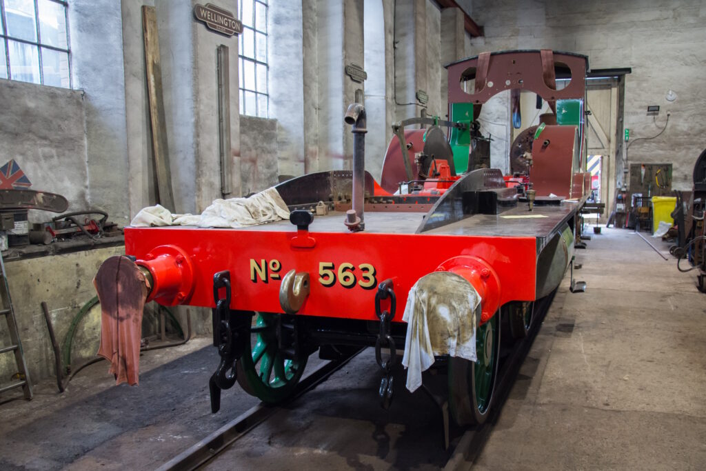 In 2019, after the most detailed examination of the locomotive in its preservation history, the Swanage Railway Trust formally authorised the return of No.563 to steam. A significant fundraising campaign began, aiming to raise around £350,000 to complete the overhaul, and volunteers continued work alongside specialist contractors. Progress accelerated through 2020 and 2021: the frames were shot‑blasted and repaired, the wheelsets inspected, and a major milestone was reached with the locomotive being re‑wheeled at the Flour Mill in 2022. By this point, construction of the new firebox and the ordering of boiler tubes were underway, with the project entering its most expensive and labour‑intensive phase.